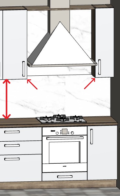 7) Размещать рядом с верхним угловым шкафом (ВУ, ВУЛ) пенал или купольную вытяжку не рекомендуется. В ином случае, открывать дверцу углового шкафа станет проблематично.